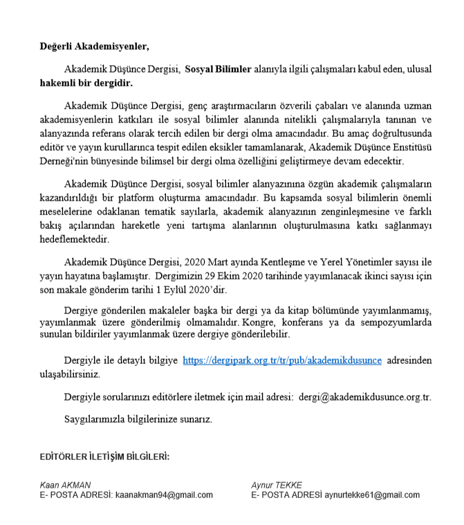 Akademik Düşünce Dergisi 2. Sayısı için DergiPark sistemi üzerinden makale kabul süreci başlamıştır.