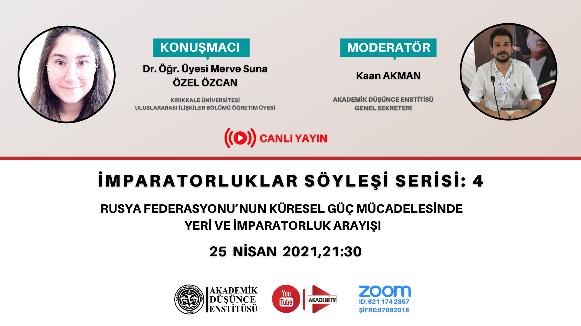 Akademik Düşünce Enstitüsü’nün Youtube kanalında Genel Sekreterimiz Kaan AKMAN’ın yönettiği ve Kırıkkale Üniversitesi Öğretim Üyesi Dr. Öğr. Üyesi Merve Suna ÖZEL ÖZCAN’ın konuk olduğu 4 bölümden oluşan söyleşi serisi gerçekleştirdi. 17. 03. 2021 tarihinde başlayan söyleşi serisinin son bölümü 25.04.2021 tarihinde youtube kanalında yayınlandı.