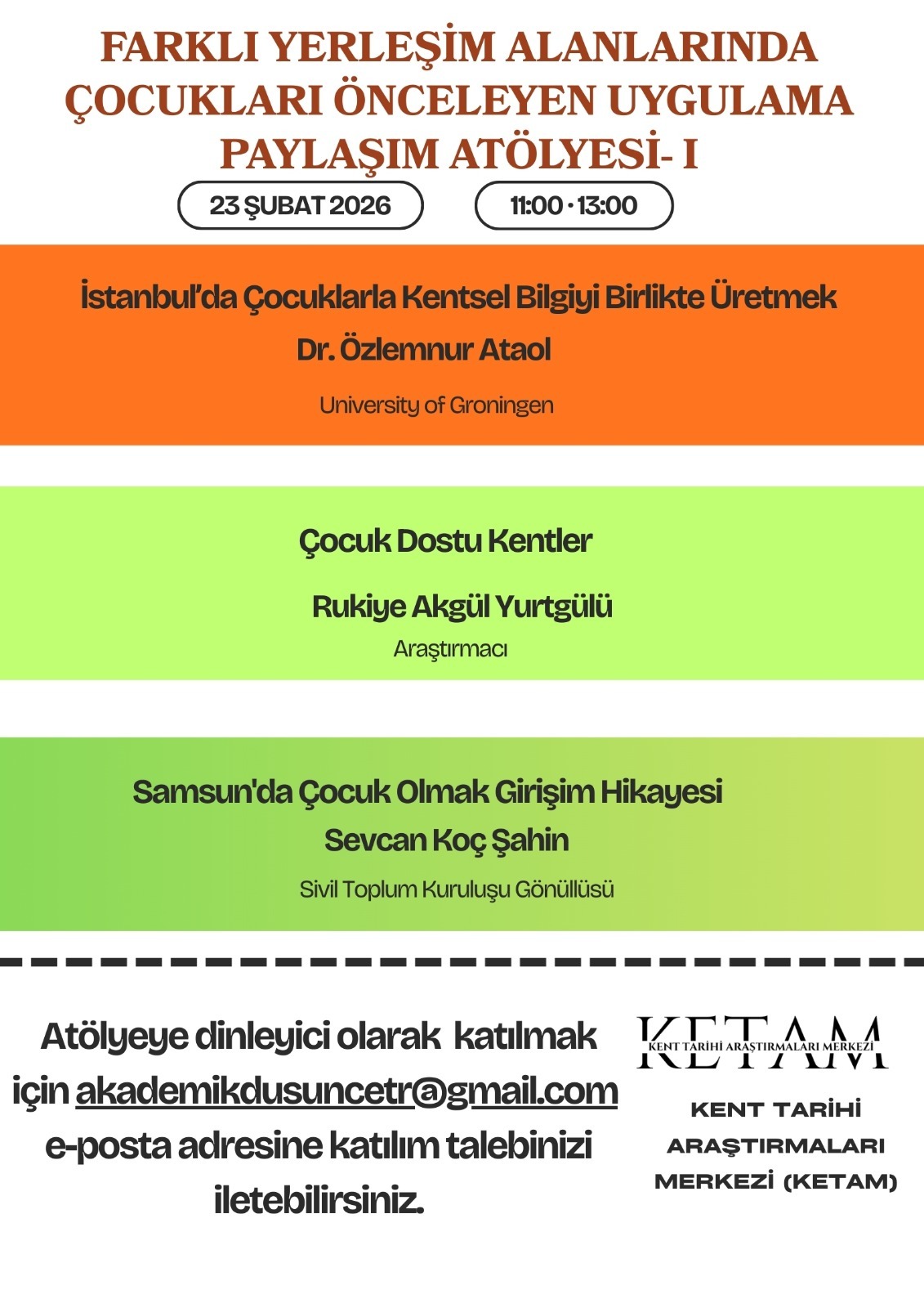 KETAM tarafından Çocuklar İçin Şehri Birlikte Düşünelim çağrısı ile başlatılan “Farklı Yerleşim Alanlarında Çocukları Önceleyen Uygulama Paylaşım Atölyesi“nin ilki tamamlandı.