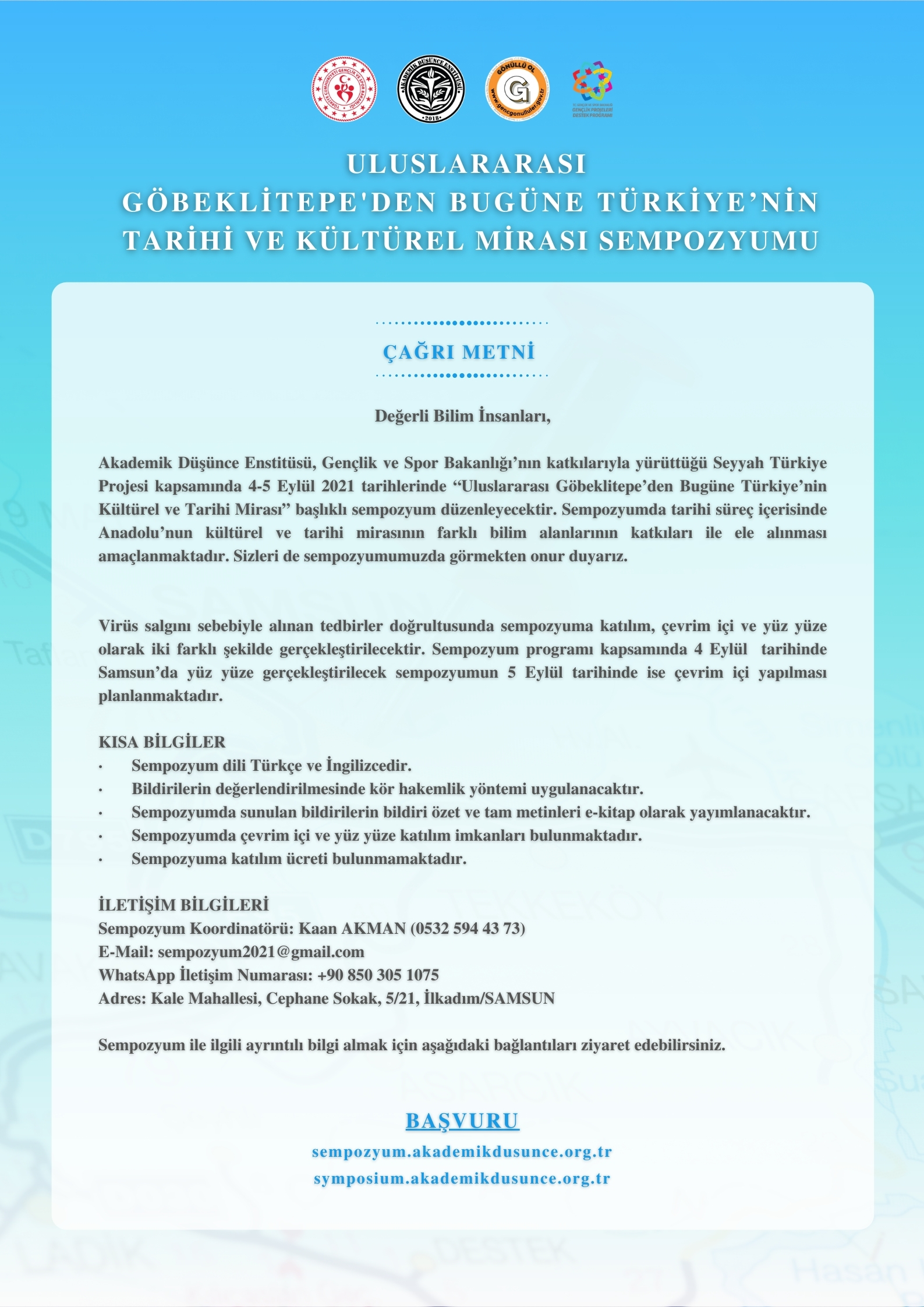 Akademik Düşünce Enstitüsü, Gençlik ve Spor Bakanlığı’nın GPDP 2020-1 Destek Programıyla yürüttüğü Seyyah Türkiye Projesi kapsamında 4-5 Eylül 2021 tarihlerinde “Göbeklitepe’den Bugüne Türkiye’nin Kültürel ve Tarihi Mirası” başlıklı uluslararası sempozyum düzenleyecektir. Sempozyumda tarihi süreç içerisinde Anadolu’nun kültürel ve tarihi mirasının farklı bilim alanlarının katkıları ile ele alınması amaçlanmaktadır. Sizleri de sempozyumumuzda görmekten onur duyarız.